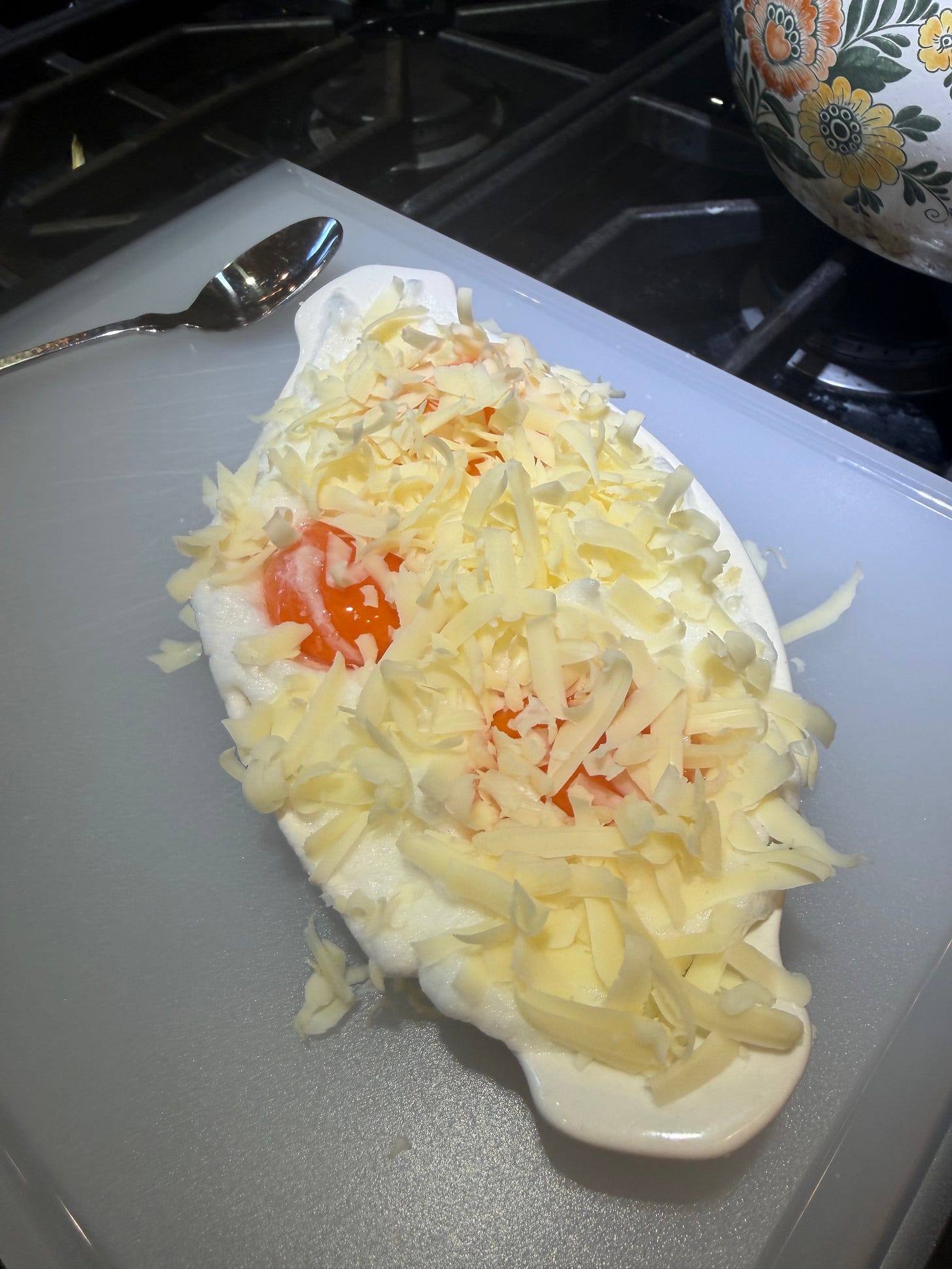 Butter a terrine dish or large ramekin. Then scoop the egg whites into the terrine dish. Spread the egg whites in a thin even layer. Form three indentations in the frothy whites with the back of a spoon. Note: I tried making an indentation with an actual egg and they wouldn’t stay, so use the spoon. After the yolks have chilled for 30 minutes, place one yolk–very carefully!--into each depression. Do not break the yolks! Then sprinkle with the remaining salt. Finally scatter the grated cheese over the top of everything.