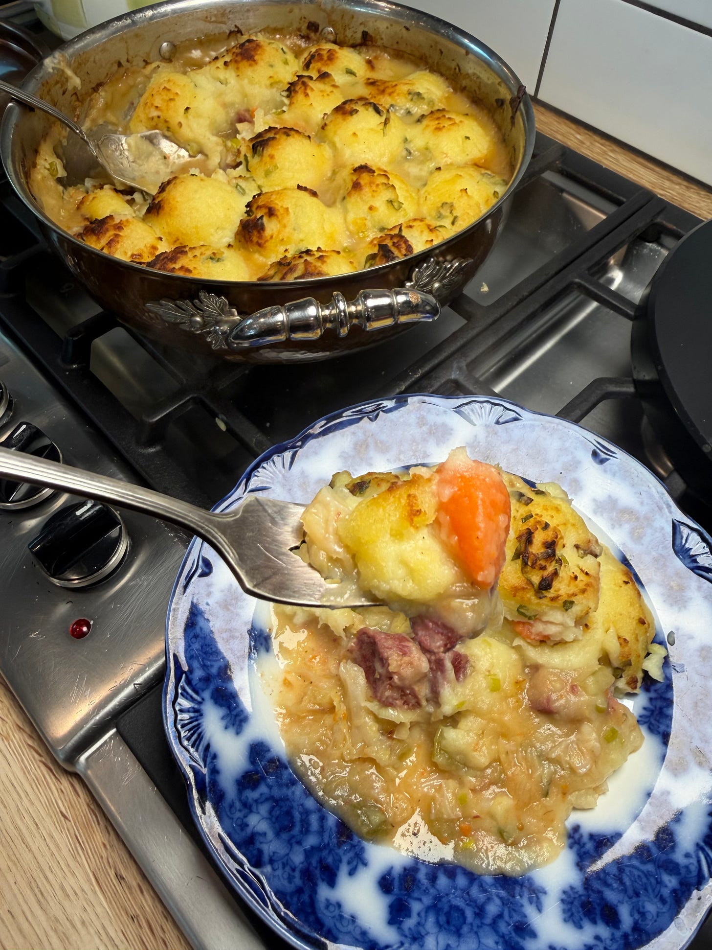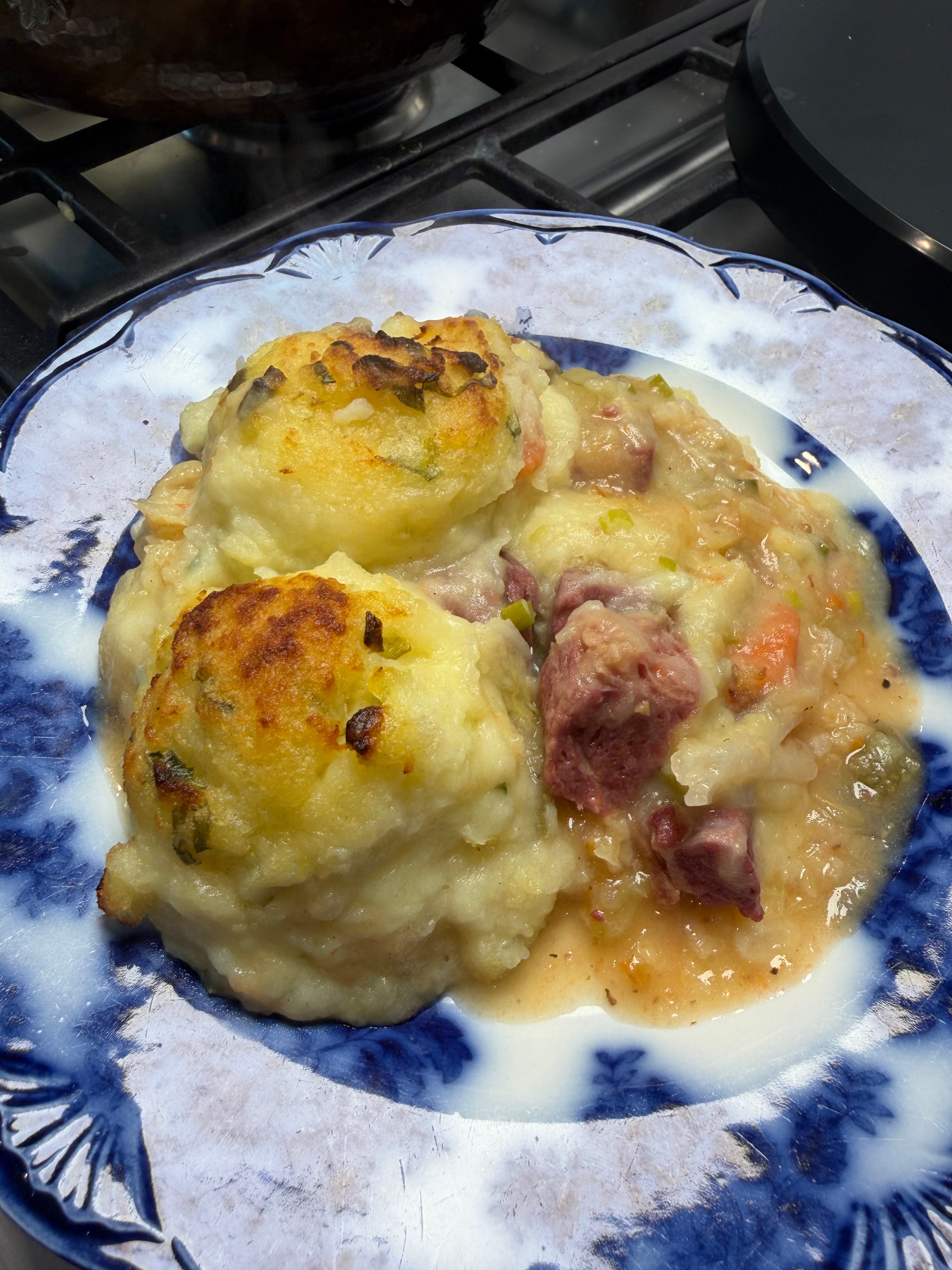 This year to celebrate St. Patrick’s Day, I made Champ and then topped a beautifully savory slow cooked corned beef and cabbage pie filling with it. I am calling it St. Patrick’s Pie and it was every bit as delicious as it seems. It’s a full meal and it was a banger. The idea came from one of my girlfriends who told me to make my Poultryman’s Pie but with corned beef. Thank you Emily, you are a genius. The test run I made this week was given to neighbors to try and they all knocked on my door to tell me how good it was. Not only does it stretch the corned beef, but it’s nice to do something different sometimes. Below are 2 recipes. One for Champ, which is one of the best ways to eat potatoes ever and the next is for the pie.