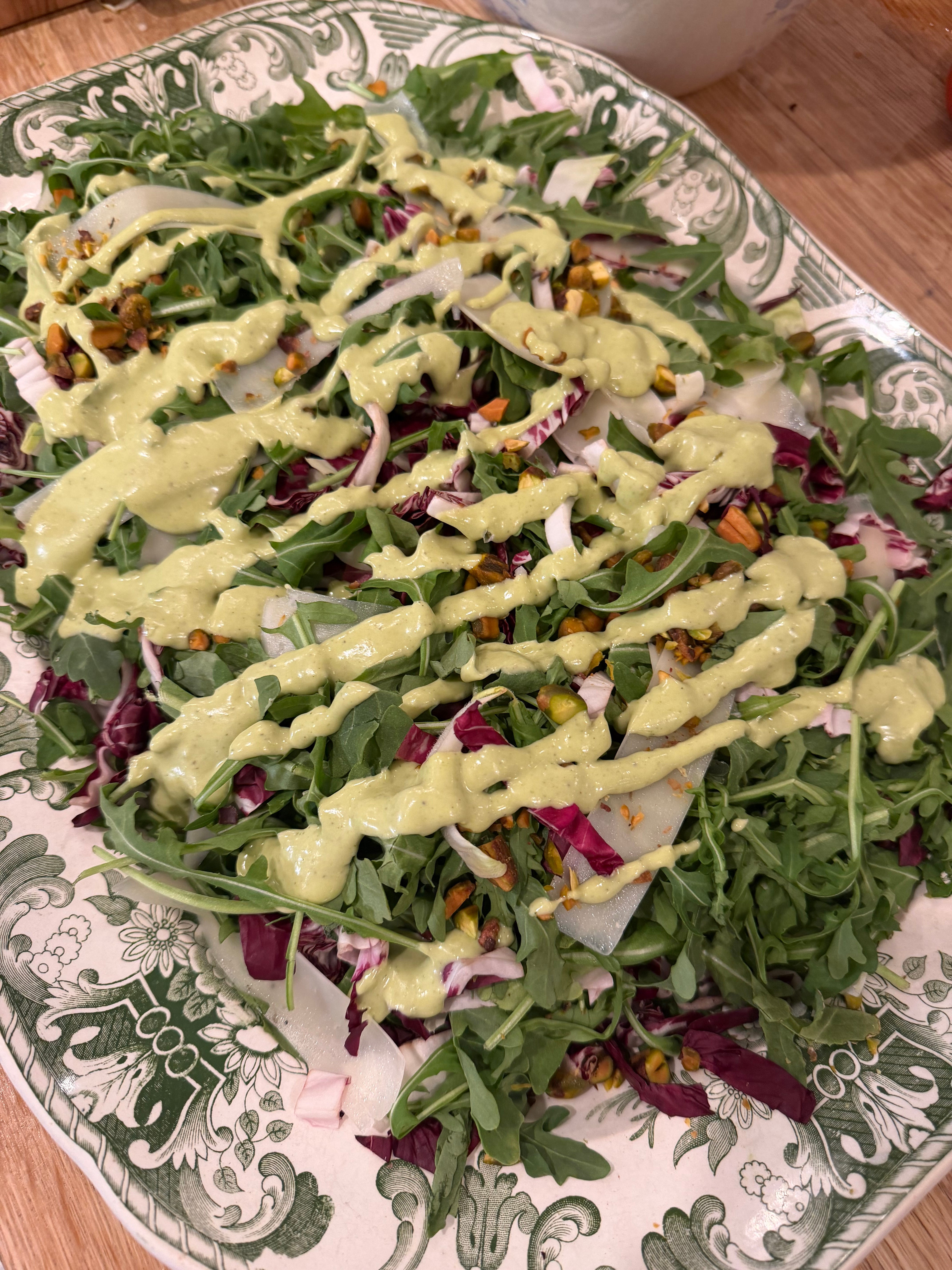 For this party, I served a lot of anchovy dishes. These gals have great palates and I knew they would appreciate, rather than be apprehensive, of my favorite flavor bomb ingredient. The Bagna Cauda with crudité was literally lapped up but the clear winner of the night was the Bagna Cauda salad dressing. I am sure the entire salad was good, but the dressing is what made this dish the star. Not only did I barely have enough and certainly did not have enough for seconds. But, it was also the first and only dish to be sold out entirely. I always make a lot of food at these dinners so I can send everyone home with a doggie bag. This was not the case with the salad. So without further ado, I give you a beautiful Winter salad with an herby Bagna Cauda dressing.